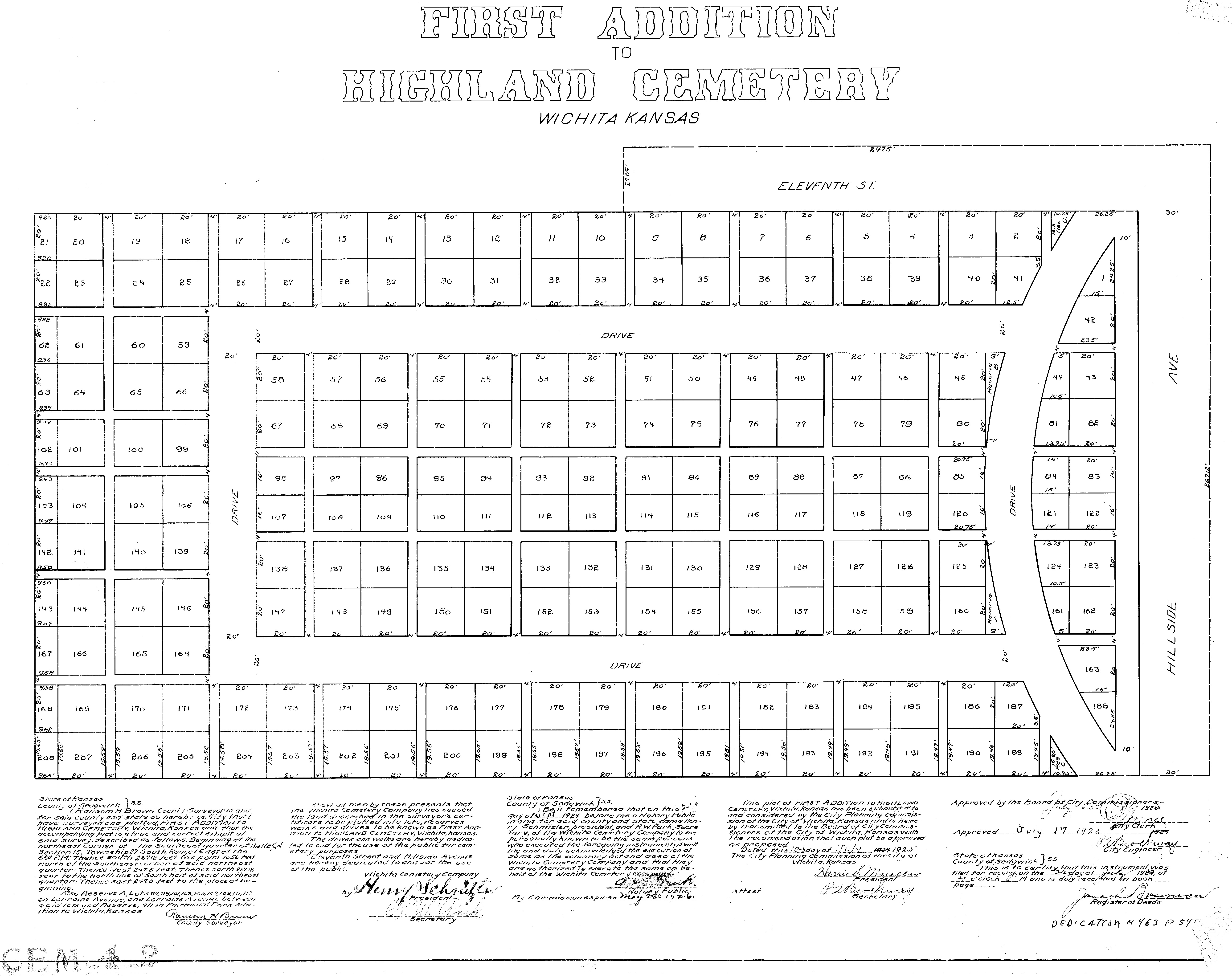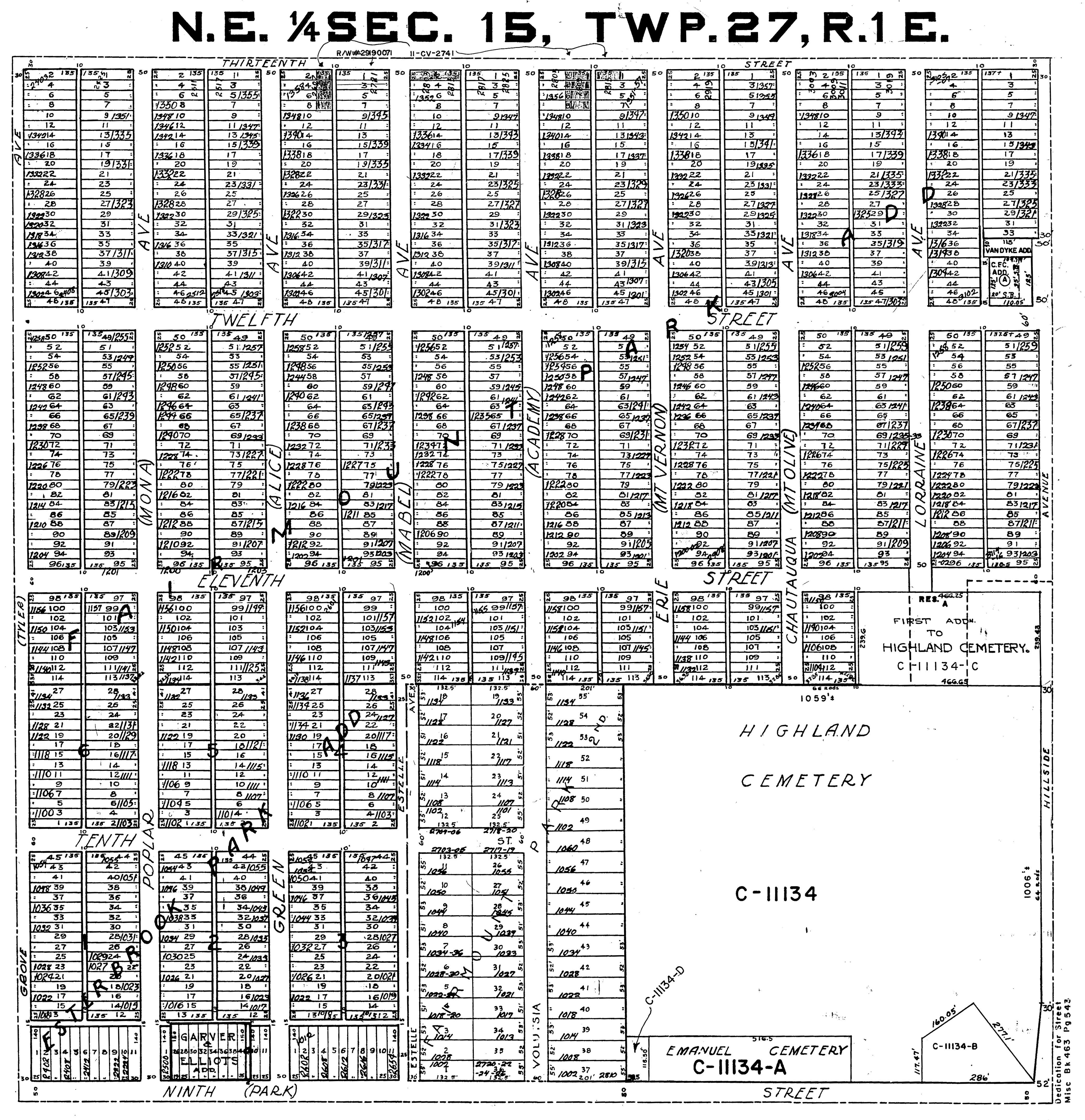 "A plat is a parcel of land that has been divided into lots, blocks, streets, etc. Most of the developed areas and cemeteries in Sedgwick County are platted, however not all land in Sedgwick County is platted." Historically, Wichita is the platted township which contains the original area of the modern City of Wichita. Highland Cemetery lies in Wichita Township, Quarter Section 57, which is the NorthEast Quarter of Section 15. The cemetery is in the south east corner of that quarter section. Original Maps can be downloaded on the County Website , and we have provided copies downloadable below.